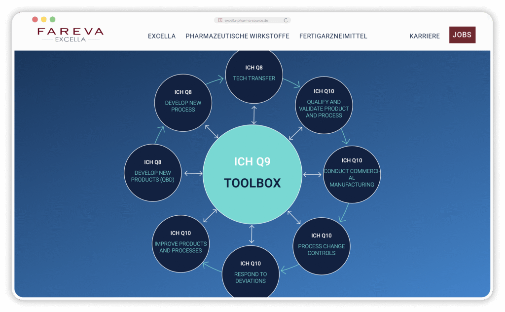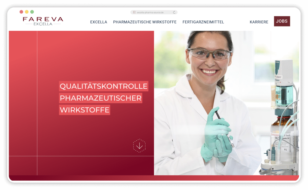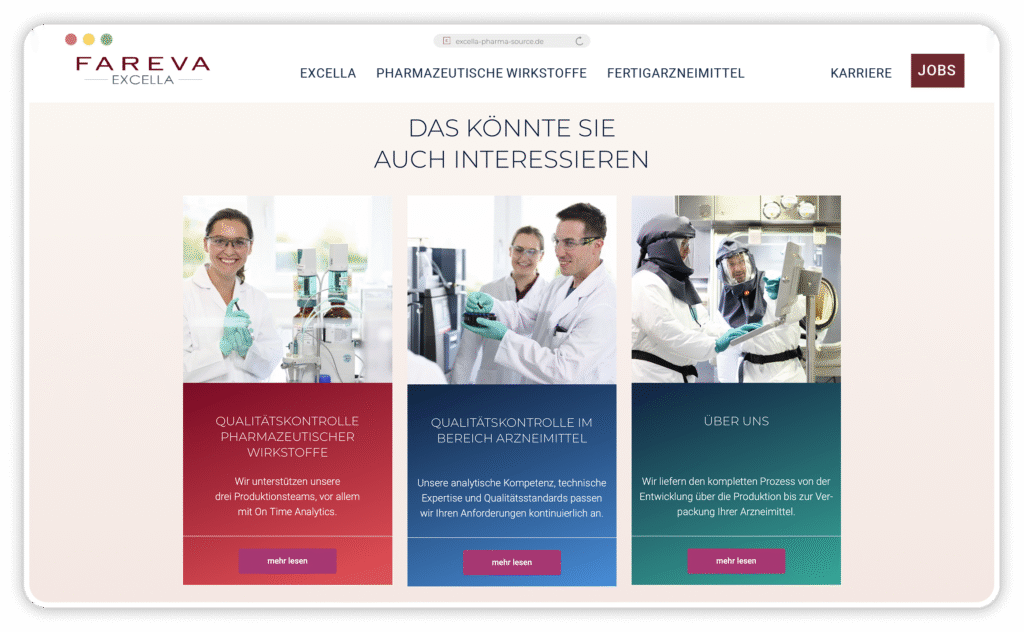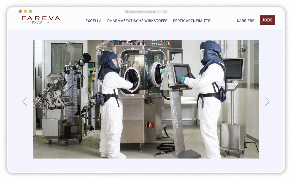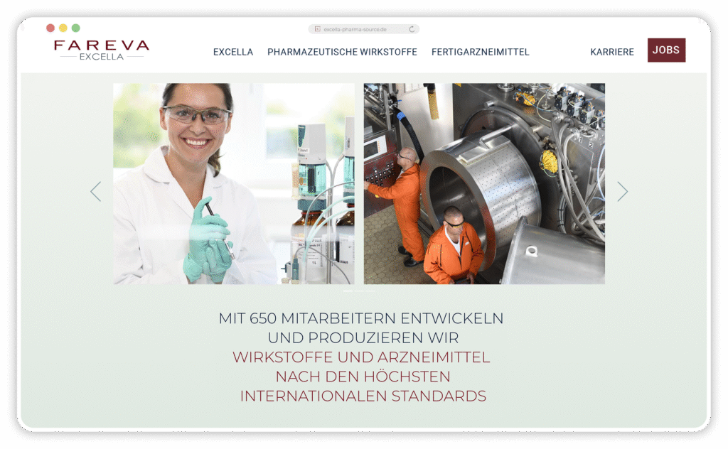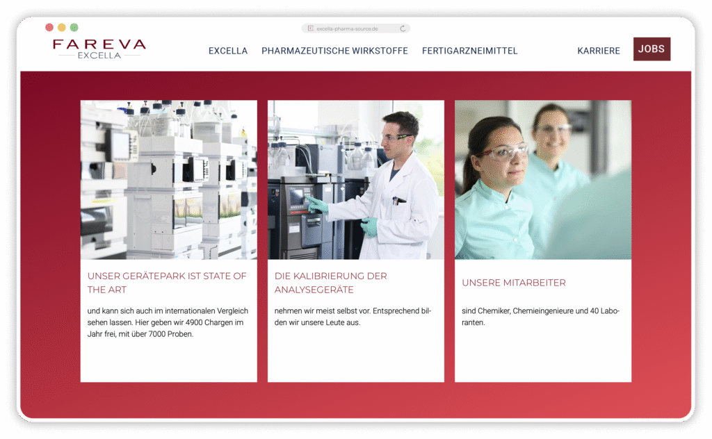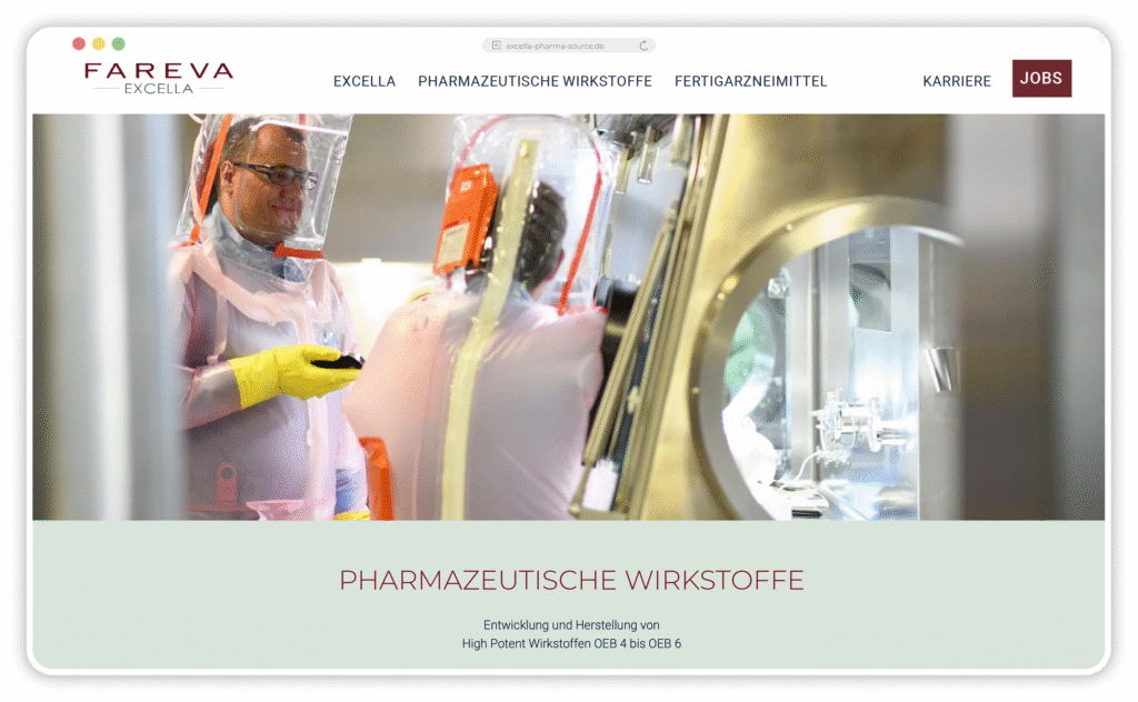 Begonnen haben wir mit diversen Workshops zur Analyse des Marken-Status Quo, dem Definieren von Markenwerten, dem Erarbeiten der Markenbotschaften und und und. Es schloss sich ein Storytelling-Prozess an, in dem wir Microstories herausgefiltert und geschrieben haben; sie bringen die Markenbotschaften auf der neuen Website zum Strahlen. Für jeden Unternehmensbereich haben wir einen eigenen Bereich auf der Website entwickelt: Entwicklung von Wirkstoffen, Produktion von Wirkstoffen, Entwicklung von Medikamenten, Qualitätskontrolle, um nur einige zu nennen.