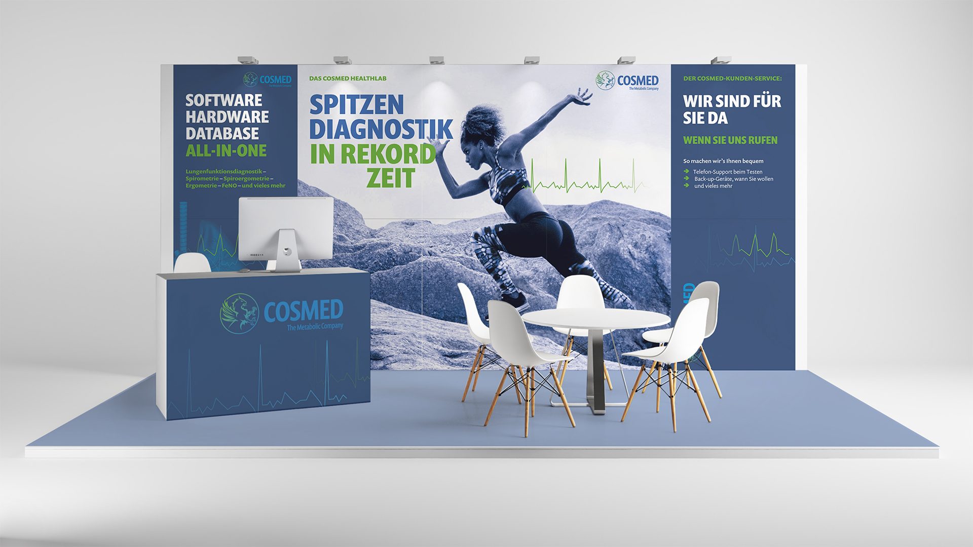 COSMED Messestand mit Markenvisuals, medizinischer Diagnostik-Kommunikation und modernem Corporate Design auf Gesundheitsmesse.